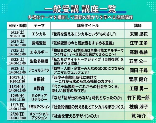 気候変動、再生可能エネルギー、人権、動物福祉など多様なテーマの専門講師から、最新かつ実践的な知識や視点を連続講座で学びます。ビジネスや日々の暮らしを見直し、「本当に持続可能な世界とは何か」を一緒に考えていきます。