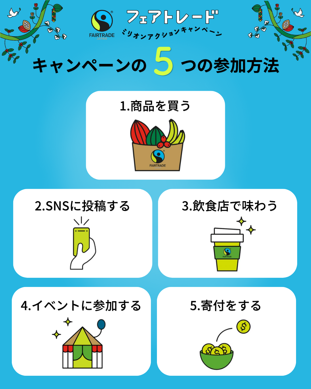 キャンペーン期間の5月1日~31日に、①フェアトレードの商品購入 ②SNS投稿(#フェアトレード2026) ③飲食店でフェアトレードのメニューの注文 ④フェアトレード関連イベントに参加 ⑤フェアトレード・ジャパンへ寄付、といったアクションを行うことで、キャンペーンにご参加いただけます。