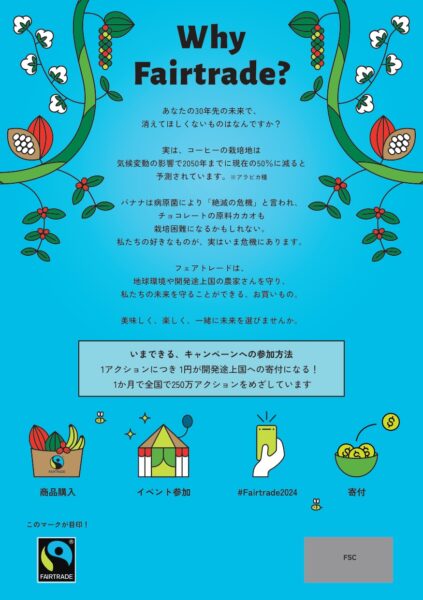 この機会に多くの方にフェアトレードを知り楽しんでいただけるよう、日本全国でお店やレストラン、企業、学校、自治体等も参加して、様々なイベントや仕掛けを用意しています。サステナブルな未来のために一人ひとりができること、是非ご参加ください!