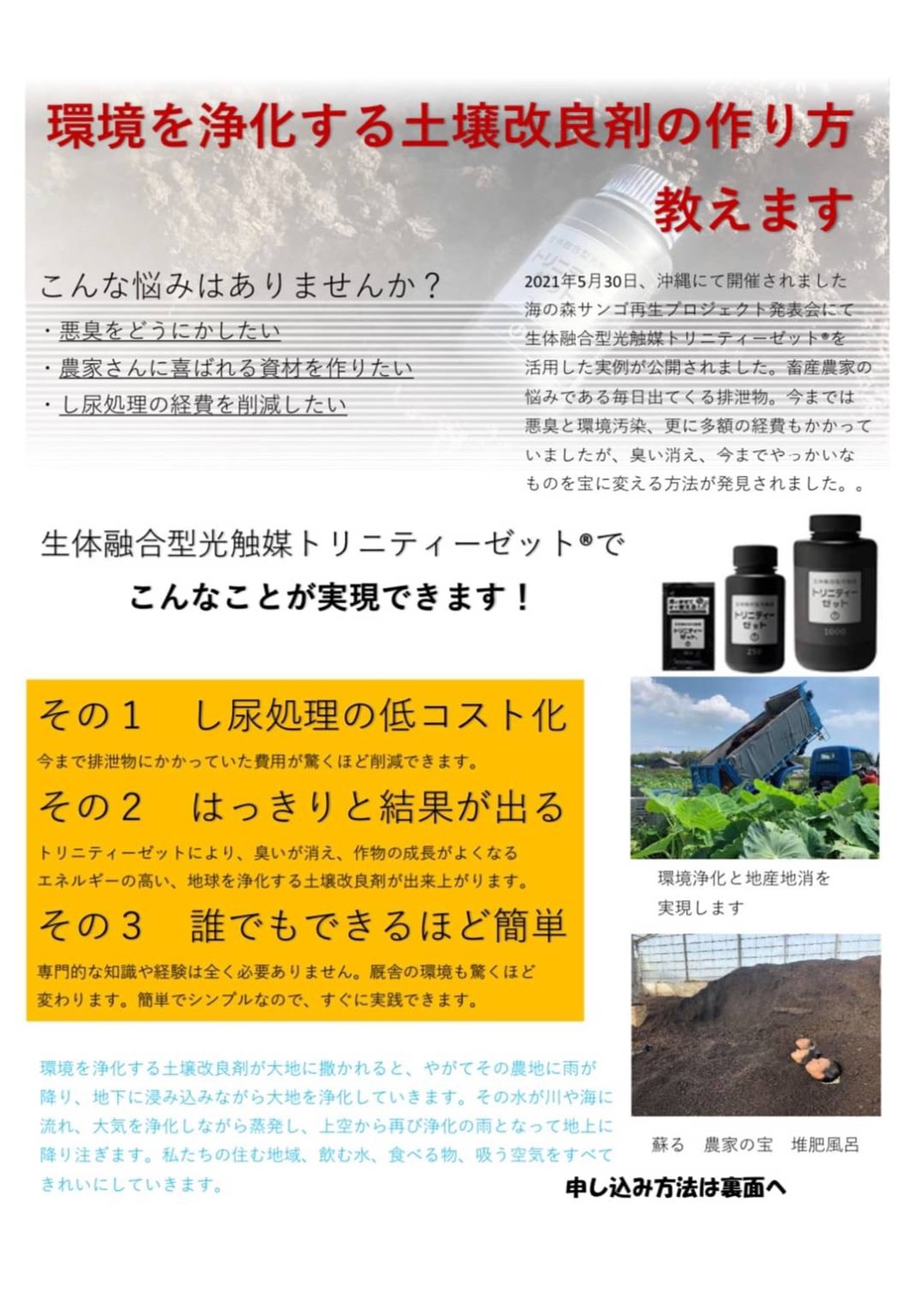 トリニティーが入っているので、そこに雨が降ったらその中の土壌を全てトリニティーが浄化しながら、その水が地下にどんどん浸み込んでいき、地下を浄化しながら、やがて地下水となって川や海に流れていき、トリニティー入っていますから、その時点で蒸発しながらやがて大気を浄化しながら、やがてどんどん上に登っていき雲になり、再びトリニティーの雨となり、浄化の雨が降り注ぐという、そのサイクルがあると、この地球環境はものすごいスピードでキレイな方向に向かっていく。その結果の一つが珊瑚が増えていくことと思っています。