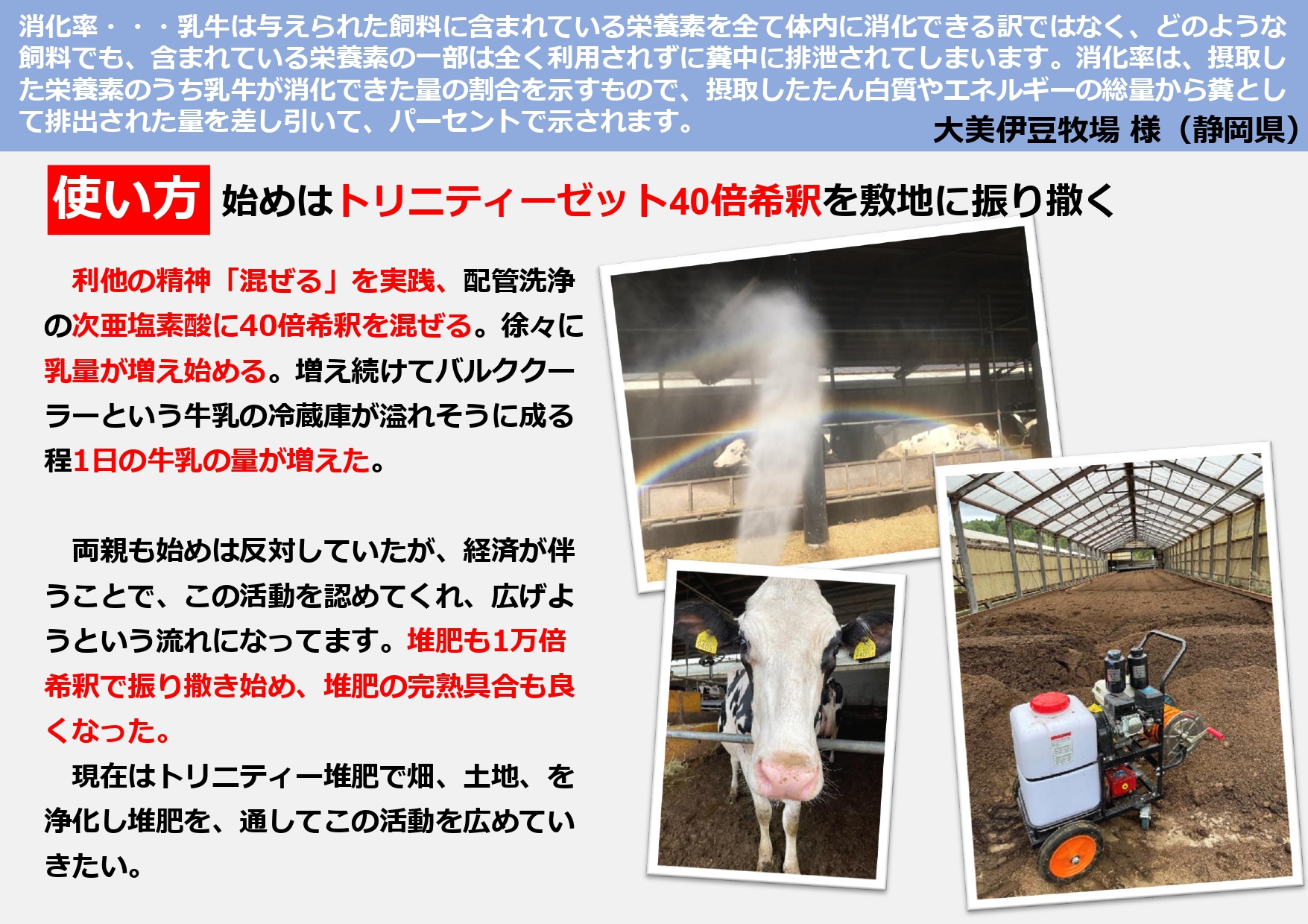 この堆肥を使うと牛が排泄したものが、まずトリニティーゼットで良い堆肥になり、それを畑に入れることで、そこの畑が栄養満点の畑に変わり、変わっていくと同時に