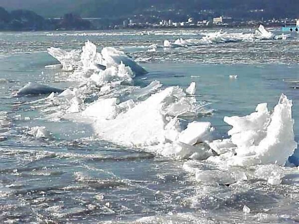 諏訪湖が全面結氷すると南の岸から北の岸へかけて氷が裂けて、高さ30cmから1m80cm位の氷の山脈ができます。
