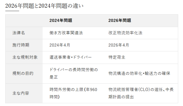 わかりやすく言えば、2024年問題は物流業界の働き手であるドライバ―が働きすぎないようにするためのルールづくりに関する内容。それに対し、2026年問題はドライバーが効率よく働けない原因となっている荷主企業側や物流業界全体に対して、構造改革をしていこうという内容だ。
