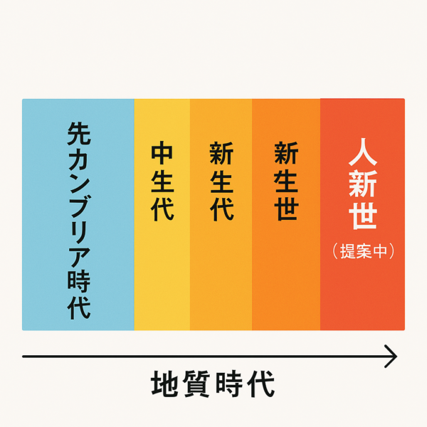 ① 地球の時代区分の図 🌀 「人新世」は、地球の長い歴史の中で新たに提案された時代区分。人間の活動が地球環境に与える影響の大きさを象徴しています。