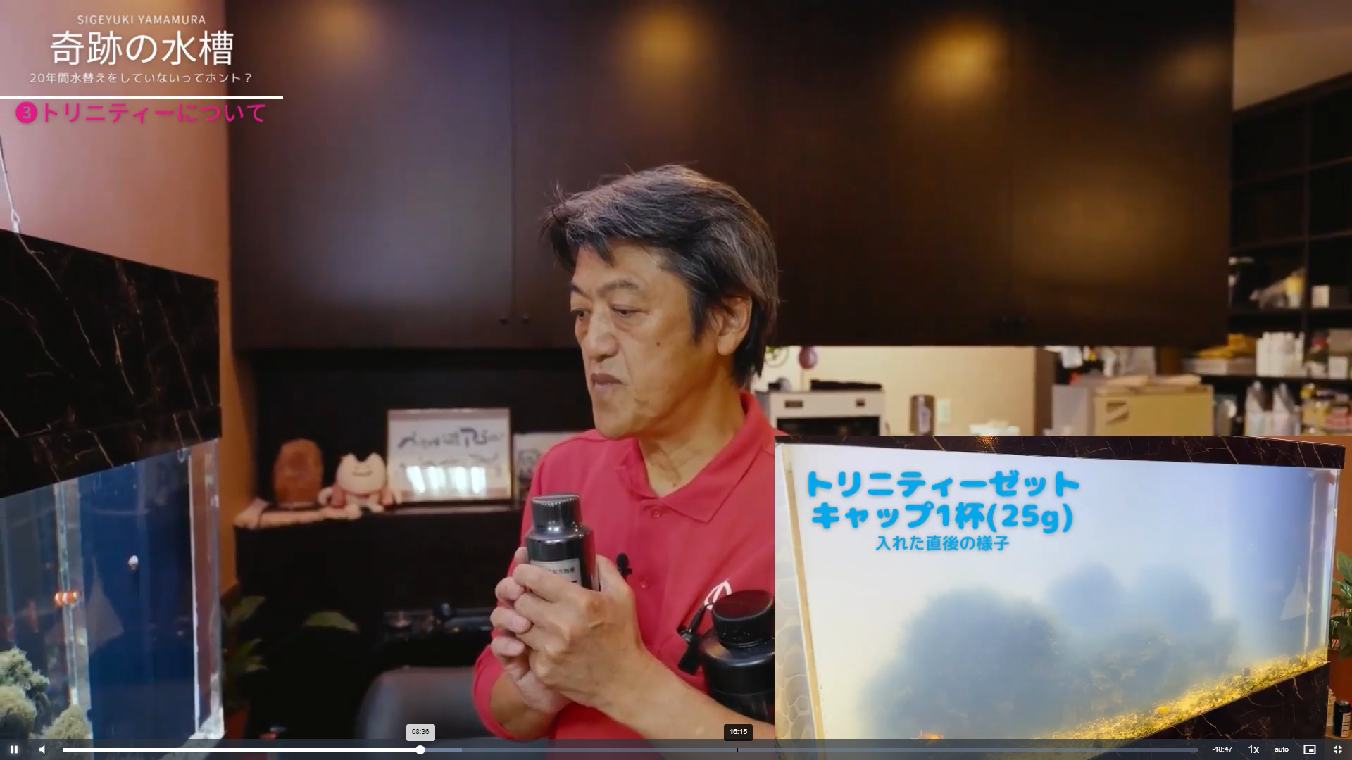 この水槽は海水魚を飼っていることもあり、水分は蒸発します。塩分濃度が濃くなる為、2ヶ月に1度水を足し、トリニティーをキャップに1杯、水槽の中に入れ続けています(18年間繰り返し継続中)。